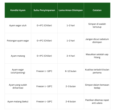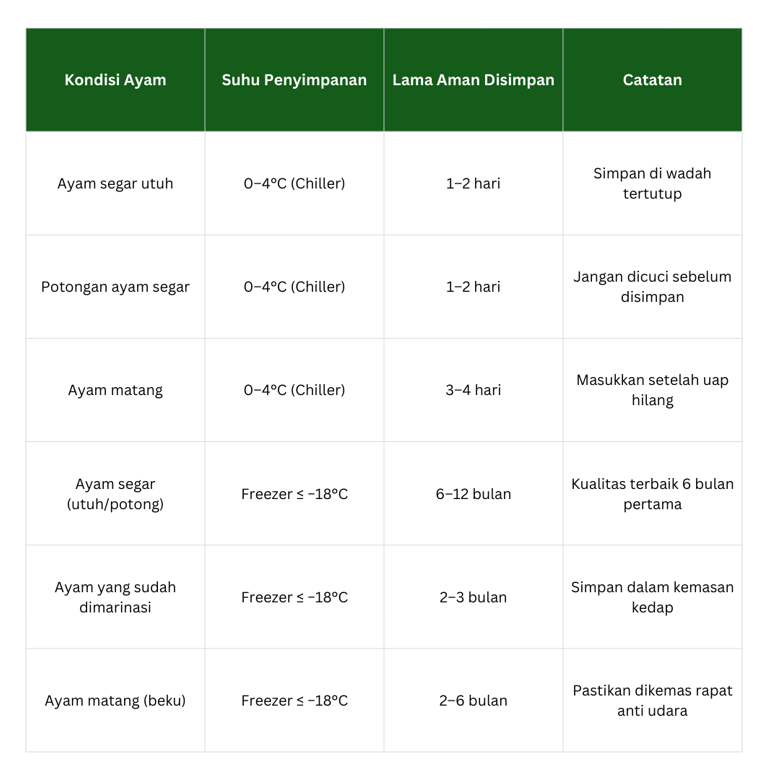 Semakin stabil suhu penyimpanan, semakin lama kualitas ayam bisa dipertahankan.